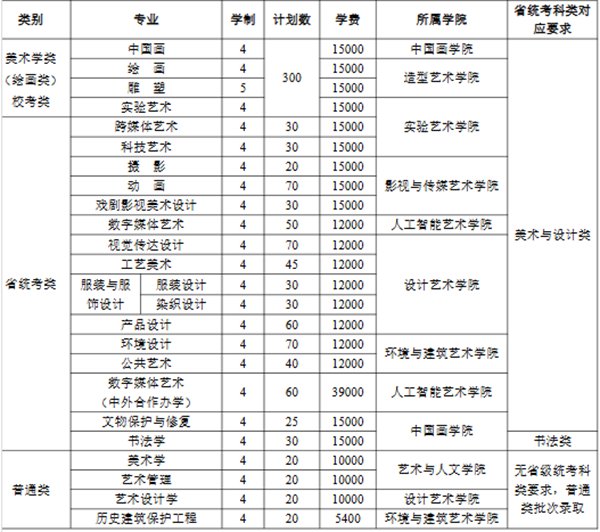 2.报考省统考类专业(美术与设计类)的考生须省级“美术与设计类”(本科)统考合格,报考书法学专业的考生须省级“书法类”(本科)统考合格,具体录取批次及分省招生计划以各省(区、市)当年招生文件为准。