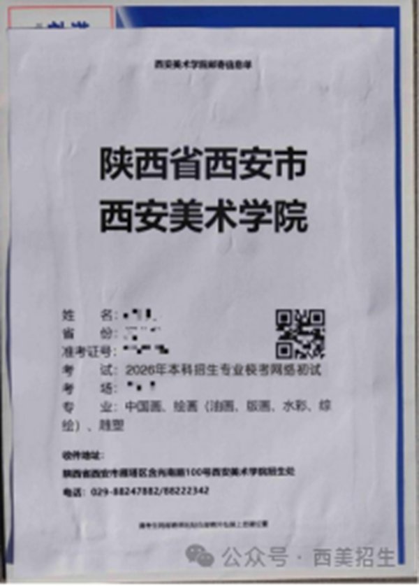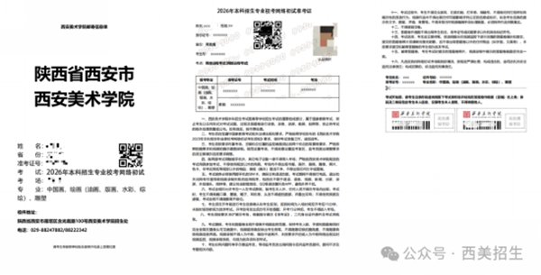 考生须于2026年1月12日9:00~2026年1月15日19:00登录西安美术学院本科招生专业校考网上报名系统(https://user.artsstudent.cn/login/10729.htm),点击“打印中心”→“打印准考证”打印准考证和邮寄信息单(邮寄信息单和准考证图例如下图所示)。