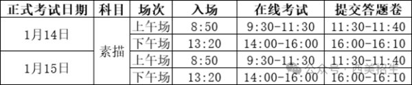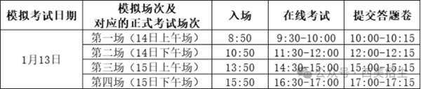 在线测试于2026年1月12日12:30-20:30进行,每位考生须在准考证上规定的两个在线测试场次中,至少选择一场进行测试,熟悉考试流程,在线测试场次及时间安排如下: