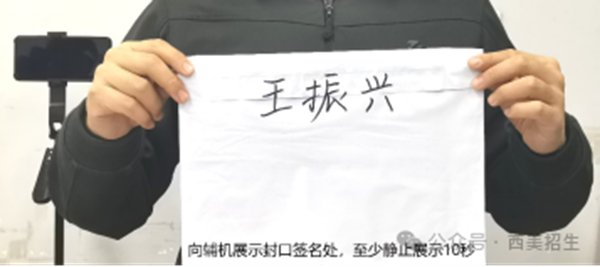 考试结束并按要求提交答题卷照片后,在辅机的监控下,立即将答题卷装入防水密封袋并用封口胶带密封,同时在封口处用油性记号笔骑缝签名,并在辅机位镜头前进行展示、确认、封装(如下图所示),密封好的答题卷不得拆封。