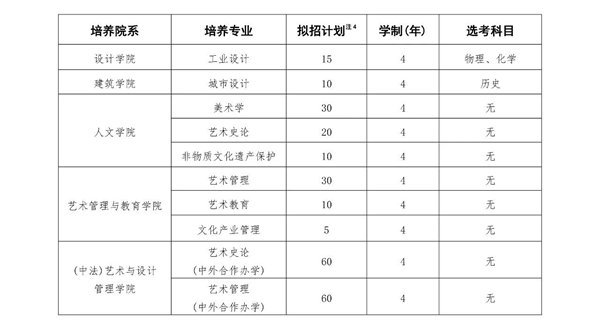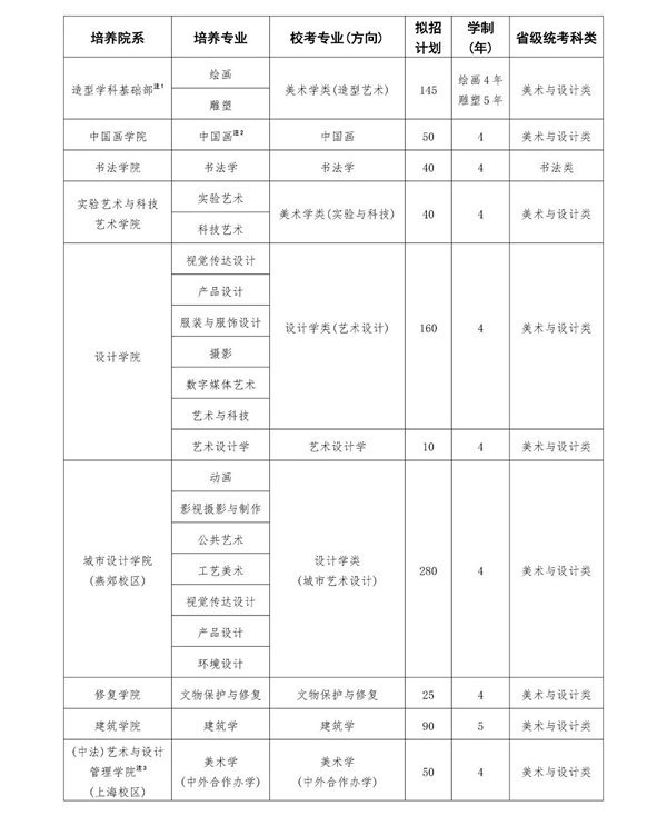 美术学类(造型艺术)、中国画、书法学、美术学类(实验与科技)、设计学类(艺术设计)、艺术设计学、设计学类(城市艺术设计)、文物保护与修复、建筑学、美术学(中外合作办学)专业面向华侨港澳台联招考生招收本科生。