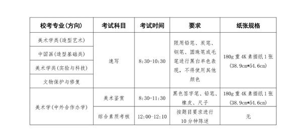 美术学类(造型艺术)、中国画(造型基础类)、美术学类(实验与科技)、文物保护与修复专业组织线上考试和现场考试。线上考试成绩仅按合格或不合格评定,取得线上考试成绩合格的考生方可参加现场考试。