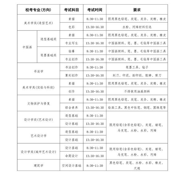 (1)美术学类(造型艺术)、中国画、书法学、美术学类(实验与科技)、设计学类(艺术设计)、设计学类(城市艺术设计)、文物保护与修复专业,高考综合改革省(区、市)考生高考文化课成绩达到所在省(区、市)普通本科相应科类录取控制分数线;西藏、新疆考生高考文化课成绩达到所在自治区普通本科二批相应科类录取控制分数线。